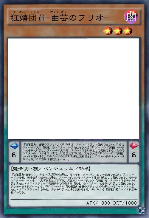| 「狂嬉団員-曲芸のフリオ-」のP効果は1ターンに1度しか発動できない。①自分フィールド上の「狂嬉」モンスター1体またはもう片方のPゾーンの「狂嬉」カード1枚を手札に戻し、フィールド上のモンスター1体を対象として発動できる。そのモンスターのレベルを2つまで上げるまたは下げる。②もう片方のPゾーンに「狂嬉」カードが無い場合、このカードの①のP効果は発動できず、このカードのスケールは3になる。この効果は無効化されない。 | |||