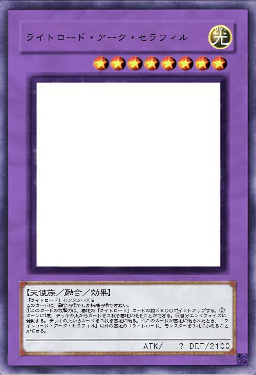 | 「ライトロード」モンスター×3 このカードは、融合召喚でしか特殊召喚できない。 ①このカードの攻撃力は、墓地の「ライトロード」カードの数×300ポイントアップする。②1ターンに1度、デッキの上からカードを2枚を墓地に送ることができる。③自分エンドフェイズに発動する。デッキの上からカードを3枚を墓地に送る。④このカードが墓地に送られたとき、「ライトロード・アーク・セラフィル」以外の墓地の「ライトロード」モンスターを手札に加えることができる。 | |||