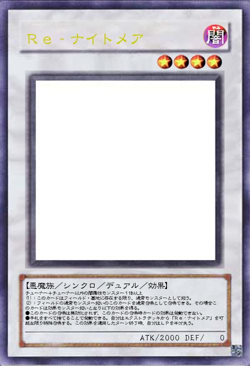 | チューナー+チューナー以外の闇属性モンスター1体以上 (1):このカードはフィールド・墓地に存在する限り、通常モンスターとして扱う。 (2):フィールドの通常モンスター扱いのこのカードを通常召喚として召喚できる。その場合このカードは効果モンスター扱いとなり以下の効果を得る。 ●このカードの召喚は無効化されず、このカードの召喚時カードの効果は発動できない。 ●手札をすべて捨てることで発動できる。自分はエクストラデッキから「Re‐ナイトメア」を可能な限り特殊召喚する。この効果を適用したターン終了時、自分はLPを半分失う。 | |||