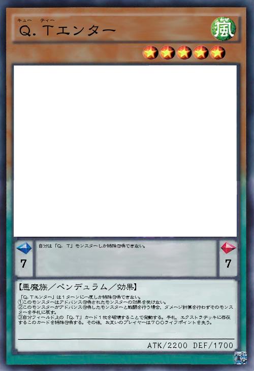 | 「Q.Tエンター」は1ターンに一度しか特殊召喚できない。 ①このモンスターはアドバンス召喚されたモンスターの効果を受けない。 ②このモンスターがアドバンス召喚したモンスターと戦闘を行う場合、ダメージ計算を行わずそのモンスターを手札に戻す。 ③自分フィールド上の「Q.T」カード1枚を破壊することで発動する。手札、エクストラデッキに存在するこのカードを特殊召喚する。その後、お互いのプレイヤーは700ライフポイントを失う。 | |||