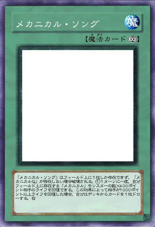 | 「メカニカル・ソング」はフィールド上に1枚しか存在できず、「メカニカルQ」が存在しない場合破壊される。①1ターンに一度、自分フィールド上に存在する「メカニカル」モンスターの数×400ポイント相手のライフを回復できる。この効果によって相手が1000ポイント以上ライフを回復した場合、自分はデッキからカードを1枚ドローする。@ | |||