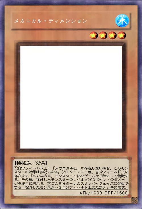 | ①自分フィールド上に「メカニカルQ」が存在しない場合、このモンスターの効果は無効になる。②1ターンに一度、自分フィールド上に存在する「メカニカル」モンスター1体をゲームから除外して発動する。その後、除外したモンスターのレベル×200ポイントのダメージを相手に与える。③次の自分ターンのスタンバイフェイズに発動できる。除外したモンスターを自分フィールド上またはデッキに戻す。 | |||