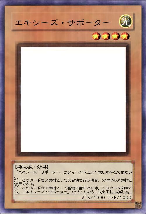| 「エキシーズ・サポーター」はフィールド上に1枚しか存在できない。 ①:このカードをX素材としてX召喚を行う場合、2体分のX素材と使用できる。 ②:このカードがX素材として墓地に置かれた時、このカードを除外し、「エキシーズ・サポーター」をデッキから1枚を手札に加える。 | |||