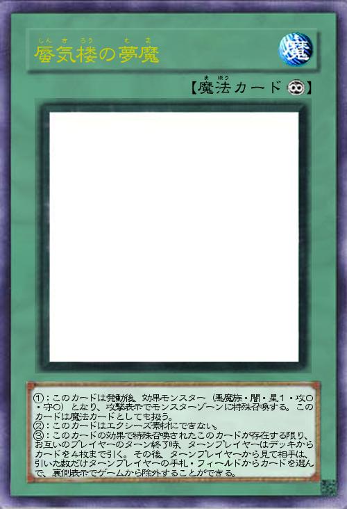 | ①:このカードは発動後、効果モンスター(悪魔族・闇・星1・攻0・守0)となり、攻撃表示でモンスターゾーンに特殊召喚する。このカードは魔法カードとしても扱う。 ②:このカードはエクシーズ素材にできない。 ③:このカードの効果で特殊召喚されたこのカードが存在する限り、お互いのプレイヤーのターン終了時、ターンプレイヤーはデッキからカードを4枚まで引く。その後、ターンプレイヤーから見て相手は、引いた数だけターンプレイヤーの手札・フィールドからカードを選んで、裏側表示でゲームから除外することができる。 | |||