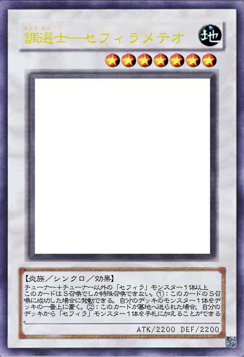 | チューナー+チューナー以外の「セフィラ」モンスター1体以上 このカードはS召喚でしか特殊召喚できない。①:このカードのS召喚に成功した場合に発動できる。自分のデッキのモンスター1体をデッキの一番上に置く。②:このカードが墓地へ送られた場合、自分のデッキから「セフィラ」モンスター1体を手札に加えることができる。 | |||
