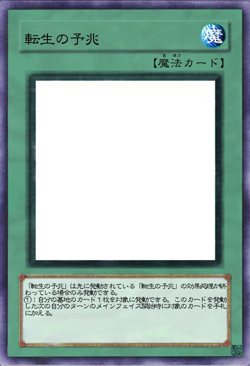| 「転生の予兆」は先に発動されている「転生の予兆」の効果処理が終わっている場合のみ発動できる。 ①:自分の墓地のカード1枚を対象に発動できる。このカードを発動した次の自分のターンのメインフェイズ開始時に対象のカードを手札に加える。 | |||