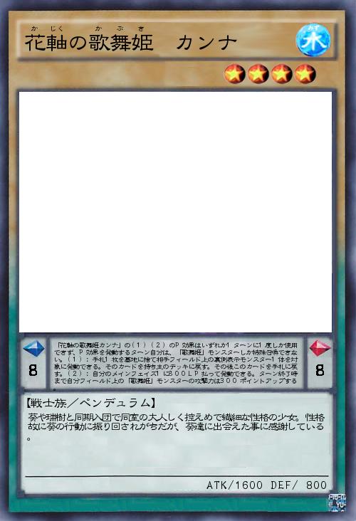 | 「花軸の歌舞姫カンナ」の(1)(2)のP効果はいずれか1ターンに1度しか使用できず、P効果を発動するターン自分は、「歌舞姫」モンスターしか特殊召喚できない。(1):手札1枚を墓地に捨て相手フィールド上の裏側表示モンスター1体を対象に発動できる。そのカードを持ち主のデッキに戻す。その後このカードを手札に戻す。(2):自分のメインフェイズ1に800LP払って発動できる。ターン終了時まで自分フィールド上の「歌舞姫」モンスターの攻撃力は300ポイントアップする。 | |||