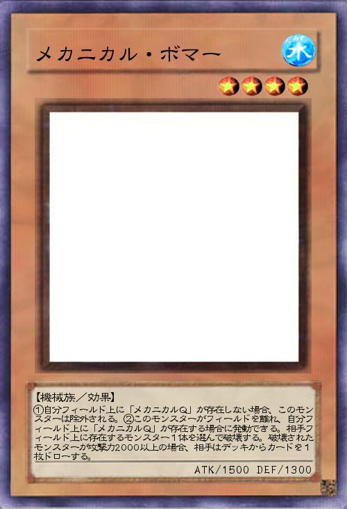 | ①自分フィールド上に「メカニカルQ」が存在しない場合、このモンスターは除外される。②このモンスターがフィールドを離れ、自分フィールド上に「メカニカルQ」が存在する場合に発動できる。相手フィールド上に存在するモンスター1体を選んで破壊する。破壊されたモンスターが攻撃力2000以上の場合、相手はデッキからカードを1枚ドローする。 | |||