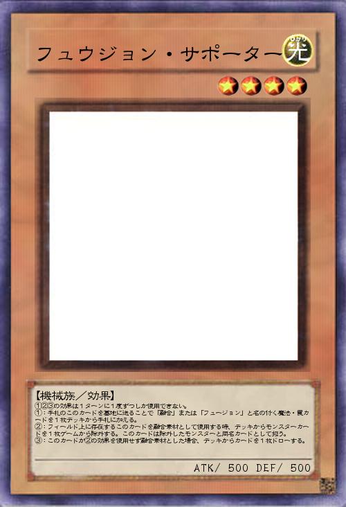 | ①②③の効果は1ターンに1度ずつしか使用できない。 ①:手札のこのカードを墓地に送ることで「融合」または「フュージョン」と名の付く魔法・罠カードを1枚デッキから手札に加える。 ②:フィールド上に存在するこのカードを融合素材として使用する時、デッキからモンスターカードを1枚ゲームから除外する。このカードは除外したモンスターと同名カードとして扱う。 ③:このカードが②の効果を使用せず融合素材とした場合、デッキからカードを1枚ドローする。 | |||