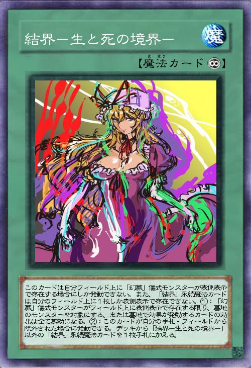 | このカードは自分フィールド上に「幻葬」儀式モンスターが表側表示で存在する場合にしか発動できない。また、「結界」永続魔法カードは自分のフィールド上に1枚しか表側表示で存在できない。①:「幻葬」儀式モンスターがフィールド上に表側表示で存在する限り、墓地のモンスターを対象にする、または墓地で効果が発動するカードの効果は全て無効になる。②:このカードが自分の手札・フィールドから除外された場合に発動できる。デッキから「結界-生と死の境界-」以外の「結界」永続魔法カードを1枚手札に加える。 | |||