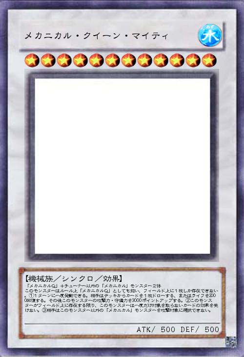 | 「メカニカルQ」+チューナー以外の「メカニカル」モンスター2体 このモンスターはルール上「メカニカルQ」としても扱い、フィールド上に1枚しか存在できない。①1ターンに一度発動できる。相手はデッキからカードを1枚ドローする、またはライフを2000回復する。その後このモンスターの攻撃力・守備力を3000ポイントアップする。②このモンスターがフィールド上に存在する限り、このモンスターは一度だけ対象を取らないカードの効果を受けない。③相手はこのモンスター以外の「メカニカル」モンスターを攻撃対象に選択できない。 | |||