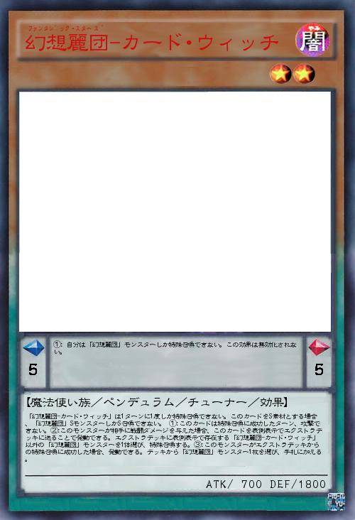 | 「幻想麗団-カード・ウィッチ」は1ターンに1度しか特殊召喚できない。このカードをS素材とする場合、「幻想麗団」SモンスターしかS召喚できない。 ①:このカードは特殊召喚に成功したターン、攻撃できない。②:このモンスターが相手に戦闘ダメージを与えた場合、このカードを表側表示でエクストラデッキに送ることで発動できる。エクストラデッキに表側表示で存在する「幻想麗団-カード・ウィッチ」以外の「幻想麗団」モンスターを1体選び、特殊召喚する。③:このモンスターがエクストラデッキからの特殊召喚に成功した場合、発動できる。デッキから「幻想麗団」モンスター1枚を選び、手札に加える。 | |||