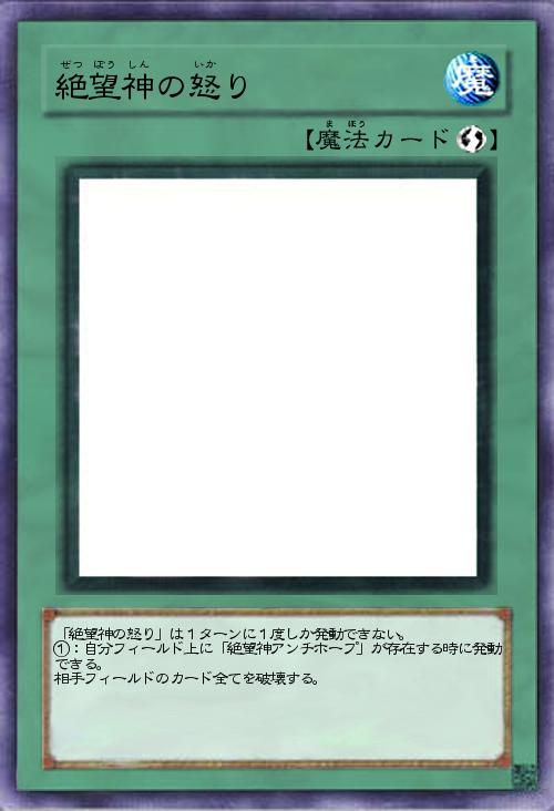 | 「絶望神の怒り」は1ターンに1度しか発動できない。 ①:自分フィールド上に「絶望神アンチホープ」が存在する時に発動できる。 相手フィールドのカード全てを破壊する。 | |||