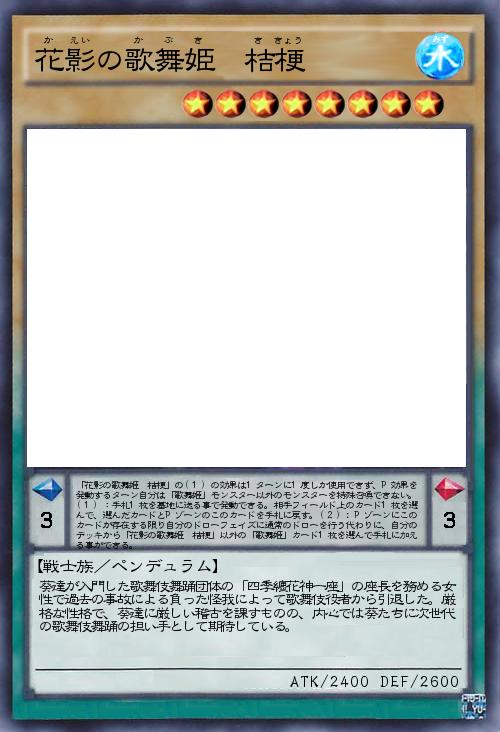 | 「花影の歌舞姫 桔梗」の(1)の効果は1ターンに1度しか使用できず、P効果を発動するターン自分は「歌舞姫」モンスター以外のモンスターを特殊召喚できない。(1):手札1枚を墓地に送る事で発動できる。相手フィールド上のカード1枚を選んで、選んだカードとPゾーンのこのカードを手札に戻す。(2):Pゾーンにこのカードが存在する限り自分のドローフェイズに通常のドローを行う代わりに、自分のデッキから「花影の歌舞姫 桔梗」以外の「歌舞姫」カード1枚を選んで手札に加える事ができる。 | |||