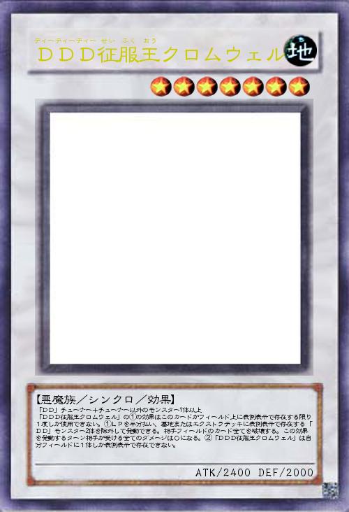 | 「DD」チューナー+チューナー以外のモンスター1体以上 「DDD征服王クロムウェル」の①の効果はこのカードがフィールド上に表側表示で存在する限り1度しか使用できない。①LPを半分払い、墓地またはエクストラデッキに表側表示で存在する「DD」モンスター2体を除外して発動できる。相手フィールドのカード全てを破壊する。この効果を発動するターン相手が受ける全てのダメージは0になる。②「DDD征服王クロムウェル」は自分フィールドに1体しか表側表示で存在できない。 | |||