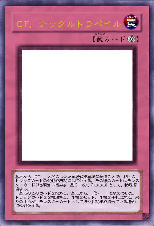 | 墓地から「CF.」と名のついた永続罠を墓地に送ることで、相手のトラップカードの発動を無効にし除外する。その後のカードはモンスターカード(地属性 機械族 星6 攻守2000)として、特殊召喚する。 墓地のこのカードを除外し、墓地から、「CF.」と名のついた、トラップカードを3枚選択し、1枚をセット、1枚を手札に加え、残りの1枚が「モンスターカードとして扱う」効果を持っている場合、特殊召喚する。 | |||