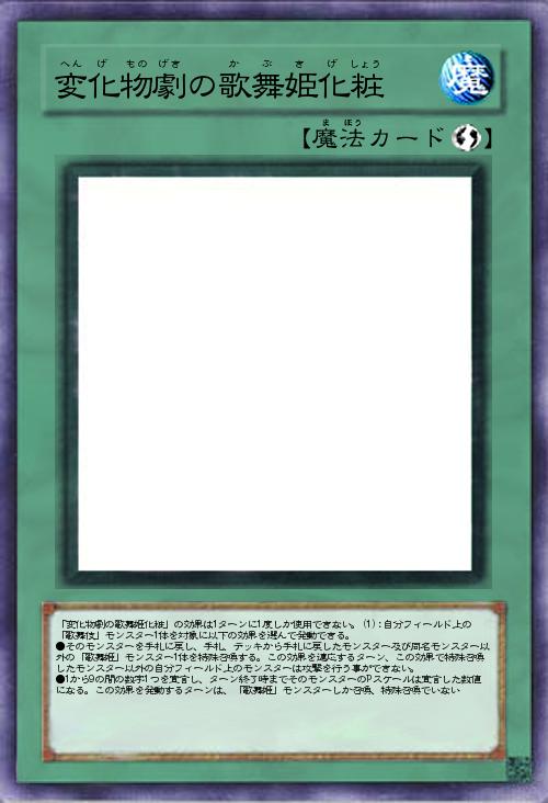 | 「変化物劇の歌舞姫化粧」の効果は1ターンに1度しか使用できない。(1):自分フィールド上の「歌舞伎」モンスター1体を対象に以下の効果を選んで発動できる。 ●そのモンスターを手札に戻し、手札、デッキから手札に戻したモンスター及び同名モンスター以外の「歌舞姫」モンスター1体を特殊召喚する。この効果を適応するターン、この効果で特殊召喚したモンスター以外の自分フィールド上のモンスターは攻撃を行う事ができない。 ●1から9の間の数字1つを宣言し、ターン終了時までそのモンスターのPスケールは宣言した数値になる。この効果を発動するターンは、「歌舞姫」モンスターしか召喚、特殊召喚でいない | |||