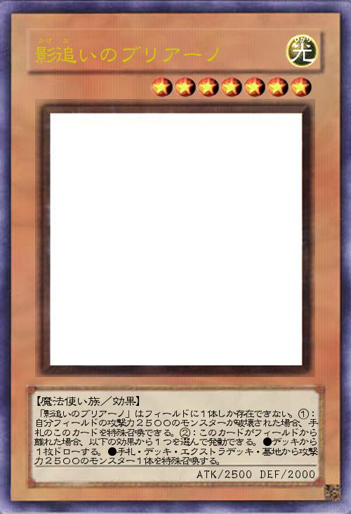 | 「影追いのブリアーノ」はフィールドに1体しか存在できない。①:自分フィールドの攻撃力2500のモンスターが破壊された場合、手札のこのカードを特殊召喚できる。②:このカードがフィールドから離れた場合、以下の効果から1つを選んで発動できる。●デッキから1枚ドローする。●手札・デッキ・エクストラデッキ・墓地から攻撃力2500のモンスター1体を特殊召喚する。 | |||