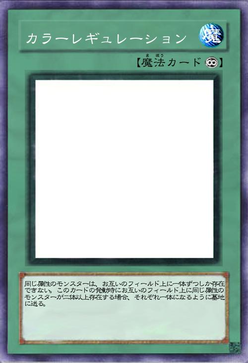 | 同じ属性のモンスターは、お互いのフィールド上に一体ずつしか存在できない。このカードの発動時にお互いのフィールド上に同じ属性のモンスターが二体以上存在する場合、それぞれ一体になるように墓地に送る。 | |||