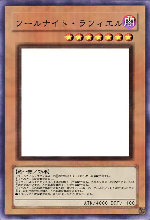 | 「フールナイト・ラフィエル」の②の効果は1ターンに1度しか発動できない。 ①:このカードは攻撃できない。 ②:フィールド上のモンスター1体を対象として発動できる。そのモンスターの攻撃力をターン終了時まで半分にする。この効果は相手ターンでも発動できる。 ③:このカードの効果が無効化された時、自分フィールド上の「フールナイト」と名の付いたモンスターは以下の効果を得る。この効果は無効化されない。 ●1ターンに1度発動できる。自分はデッキから1枚ドローする。 | |||