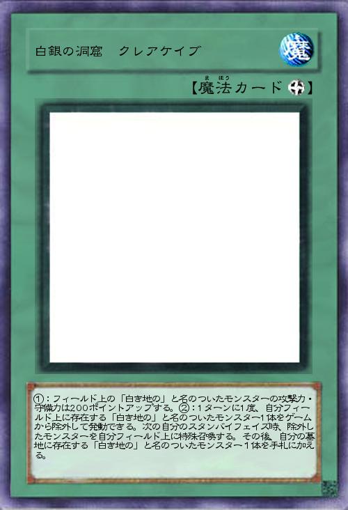 | ①:フィールド上の「白き地の」と名のついたモンスターの攻撃力・守備力は200ポイントアップする。②:1ターンに1度、自分フィールド上に存在する「白き地の」と名のついたモンスター1体をゲームから除外して発動できる。次の自分のスタンバイフェイズ時、除外したモンスターを自分フィールド上に特殊召喚する。その後、自分の墓地に存在する「白き地の」と名のついたモンスター1体を手札に加える。 | |||