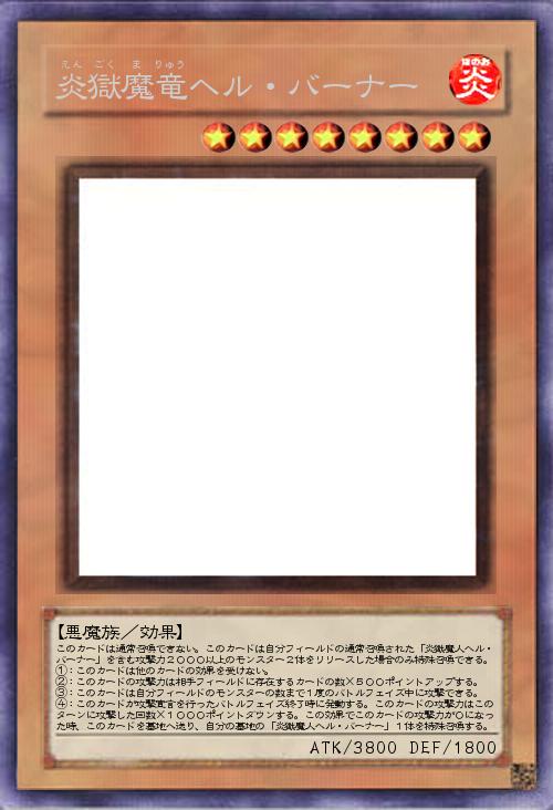 | このカードは通常召喚できない。このカードは自分フィールドの通常召喚された「炎獄魔人ヘル・バーナー」を含む攻撃力2000以上のモンスター2体をリリースした場合のみ特殊召喚できる。 ①:このカードは他のカードの効果を受けない。 ②:このカードの攻撃力は相手フィールドに存在するカードの数×500ポイントアップする。 ③:このカードは自分フィールドのモンスターの数まで1度のバトルフェイズ中に攻撃できる。 ④:このカードが攻撃宣言を行ったバトルフェイズ終了時に発動する。このカードの攻撃力はこのターンに攻撃した回数×1000ポイントダウンする。この効果でこのカードの攻撃力が0になった時、このカードを墓地へ送り、自分の墓地の「炎獄魔人ヘル・バーナー」1体を特殊召喚する。 | |||