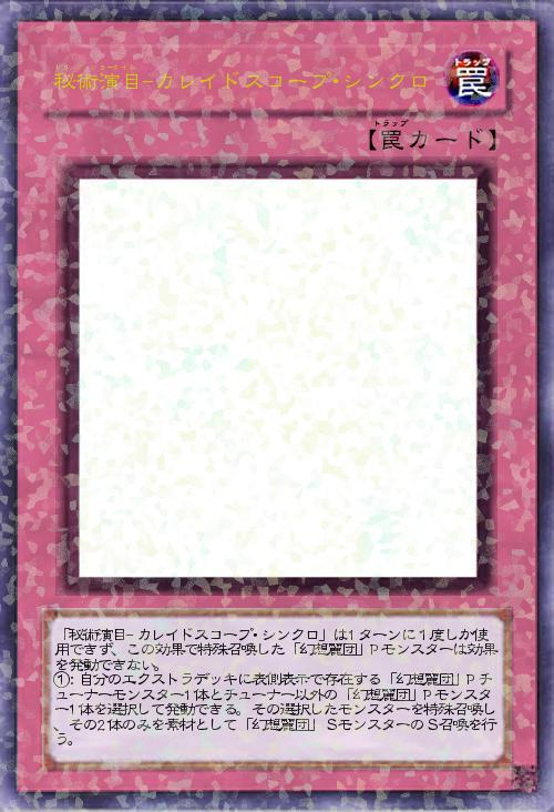 | 「秘術演目-カレイドスコープ・シンクロ」は1ターンに1度しか使用できず、この効果で特殊召喚した「幻想麗団」Pモンスターは効果を発動できない。 ①:自分のエクストラデッキに表側表示で存在する「幻想麗団」Pチューナーモンスター1体とチューナー以外の「幻想麗団」Pモンスター1体を選択して発動できる。その選択したモンスターを特殊召喚し、その2体のみを素材として「幻想麗団」SモンスターのS召喚を行う。 | |||