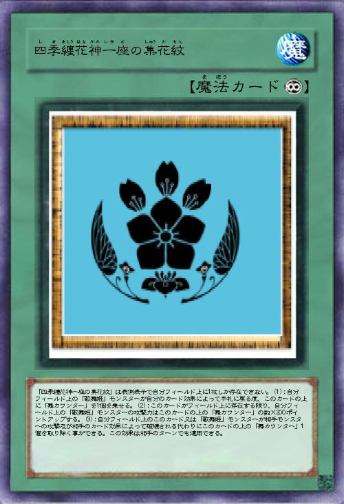 | 「四季纏花神一座の集花紋」は表側表示で自分フィールド上に1枚しか存在できない。(1):自分フィールド上の「歌舞姫」モンスターが自分のカード効果によって手札に戻る度、このカードの上に「舞カウンター」を1個を乗せる。(2):このカードがフィールド上に存在する限り、自分フィールド上の「歌舞姫」モンスターの攻撃力はこのカードの上の「舞カウンター」の数×200ポイントアップする。(3):自分フィールド上のこのカード又は「歌舞姫」モンスターが相手モンスターの攻撃及び相手のカード効果によって破壊される代わりにこのカードの上の「舞カウンター」1個を取り除く事ができる。この効果は相手のターンでも適用できる。 | |||