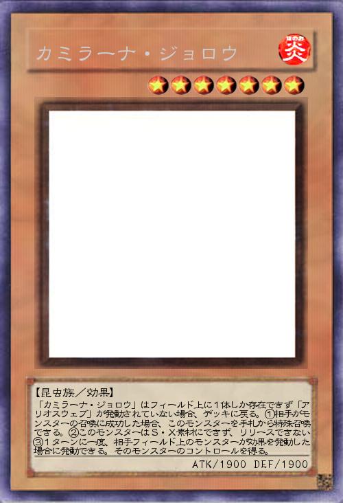 | 「カミラーナ・ジョロウ」はフィールド上に1体しか存在できず「アリオスウェブ」が発動されていない場合、デッキに戻る。①相手がモンスターの召喚に成功した場合、このモンスターを手札から特殊召喚できる。②このモンスターはS・X素材にできず、リリースできない③1ターンに一度、相手フィールド上のモンスターが効果を発動した場合に発動できる。そのモンスターのコントロールを得る。 | |||