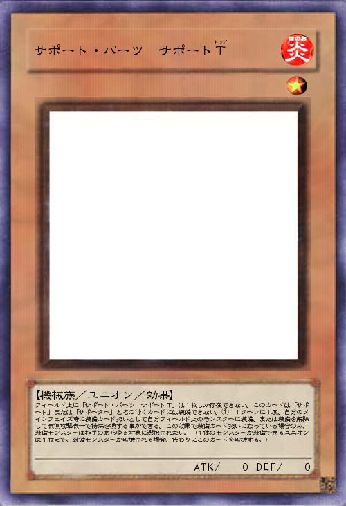 | フィールド上に「サポート・パーツ サポートT」は1枚しか存在できない。このカードは「サポート」または「サポーター」と名の付くカードには装備できない。①:1ターンに1度、自分のメインフェイズ時に装備カード扱いとして自分フィールド上のモンスターに装備、または装備を解除して表側攻撃表示で特殊召喚する事ができる。この効果で装備カード扱いになっている場合のみ、装備モンスターは相手のあらゆる対象に選択されない。(1体のモンスターが装備できるユニオンは1枚まで。装備モンスターが破壊される場合、代わりにこのカードを破壊する。) | |||