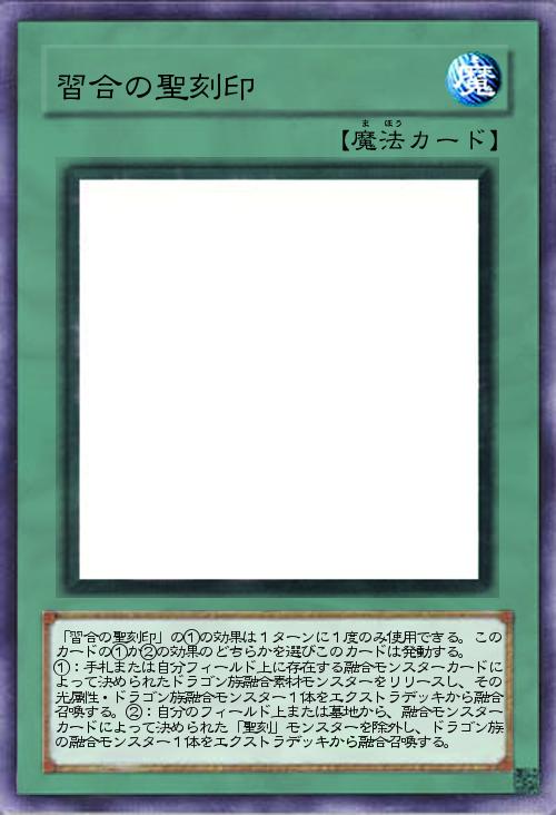 | 「習合の聖刻印」の①の効果は1ターンに1度のみ使用できる。このカードの①か②の効果のどちらかを選びこのカードは発動する。 ①:手札または自分フィールド上に存在する融合モンスターカードによって決められたドラゴン族融合素材モンスターをリリースし、その光属性・ドラゴン族融合モンスター1体をエクストラデッキから融合召喚する。②:自分のフィールド上または墓地から、融合モンスターカードによって決められた「聖刻」モンスターを除外し、ドラゴン族の融合モンスター1体をエクストラデッキから融合召喚する。 | |||