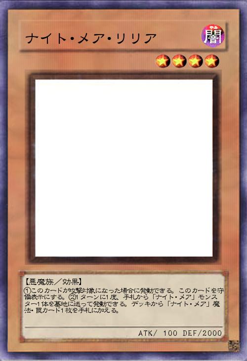 「「ナイト・メア」の女の子は攻撃力100守備力2000という共通したステータスを持っています。「ナイト・メア」では、墓地からや除外して発動する効果も考えているので、「リリア」は補助枠ですね(;´∀`)」(2015-08-15 00:32)