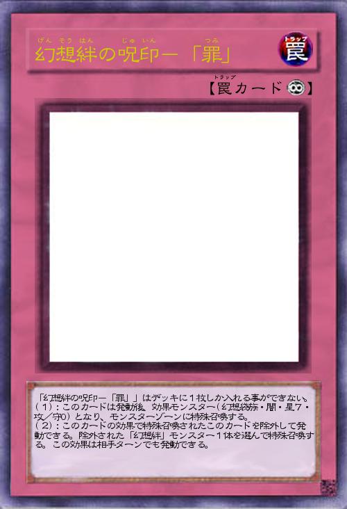 | 「幻想絆の呪印-「罪」」はデッキに1枚しか入れる事ができない。 (1):このカードは発動後、効果モンスター(幻想袋族・闇・星7・攻/守0)となり、モンスターゾーンに特殊召喚する。 (2):このカードの効果で特殊召喚されたこのカードを除外して発動できる。除外された「幻想絆」モンスター1体を選んで特殊召喚する。この効果は相手ターンでも発動できる。 | |||