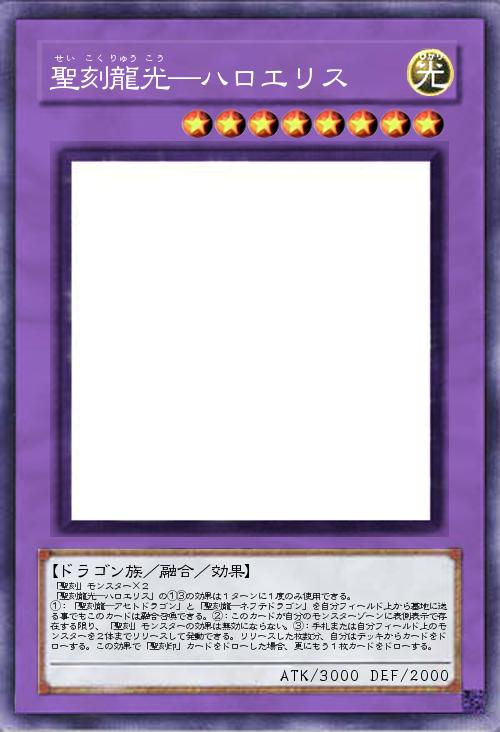 | 「聖刻」モンスター×2 「聖刻龍光―ハロエリス」の①③の効果は1ターンに1度のみ使用できる。 ①:「聖刻龍―アセトドラゴン」と「聖刻龍―ネフテドラゴン」を自分フィールド上から墓地に送る事でもこのカードは融合召喚できる。②:このカードが自分のモンスターゾーンに表側表示で存在する限り、「聖刻」モンスターの効果は無効にならない。③:手札または自分フィールド上のモンスターを2体までリリースして発動できる。リリースした枚数分、自分はデッキからカードをドローする。この効果で「聖刻印」カードをドローした場合、更にもう1枚カードをドローする。 | |||