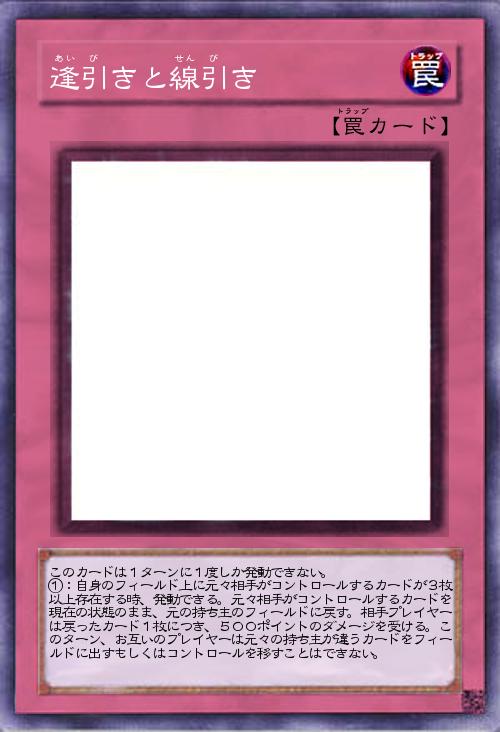 | このカードは1ターンに1度しか発動できない。 ①:自身のフィールド上に元々相手がコントロールするカードが3枚以上存在する時、発動できる。元々相手がコントロールするカードを現在の状態のまま、元の持ち主のフィールドに戻す。相手プレイヤーは戻ったカード1枚につき、500ポイントのダメージを受ける。このターン、お互いのプレイヤーは元々の持ち主が違うカードをフィールドに出すもしくはコントロールを移すことはできない。 | |||