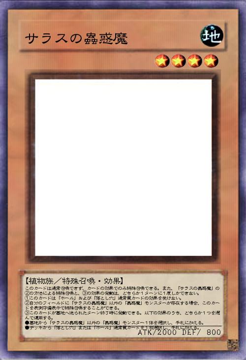 | このカードは通常召喚できず、カードの効果でのみ特殊召喚できる。また、「サラスの蟲惑魔」の②の方法による特殊召喚と、③の効果の発動は、どちらか1ターンに1度しかできない。 ①このカードは「ホール」および「落とし穴」通常罠カードの効果を受けない。 ②自分のフィールドに「サラスの蟲惑魔」以外の「蟲惑魔」モンスターが存在する場合、このカードを表側守備表示で特殊召喚することができる。 ③このカードが墓地へ送られたターン終了時に発動できる。以下の効果のうち、どちらか1つを選んで適用する。 ●墓地から「サラスの蟲惑魔」以外の「蟲惑魔」モンスター1体を選択し、手札に加える。 ●デッキから「落とし穴」または「ホール」通常罠カードを1枚選択し、手札に加える。 | |||