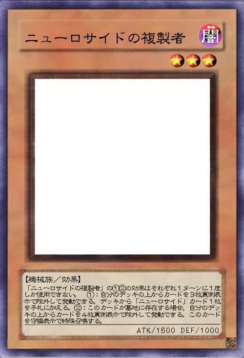 | 「ニューロサイドの複製者」の①②の効果はそれぞれ1ターンに1度しか使用できない。 ①:自分のデッキの上からカードを3枚裏側表示で除外して発動できる。デッキから「ニューロサイド」カード1枚を手札に加える。②:このカードが墓地に存在する場合、自分のデッキの上からカードを4枚裏側表示で除外して発動できる。このカードを守備表示で特殊召喚する。 | |||