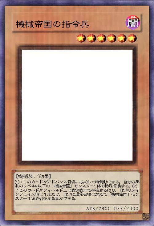 | ①:このカードがアドバンス召喚に成功した時発動できる。自分の手札のレベル4以下の「機械帝国」モンスター1体を特殊召喚する。②:このカードがフィールド上に表側表示で存在する限り、自分のメインフェイズ時に1度だけ、自分は通常召喚に加えて「機械帝国」モンスター1体を召喚する事ができる。 | |||