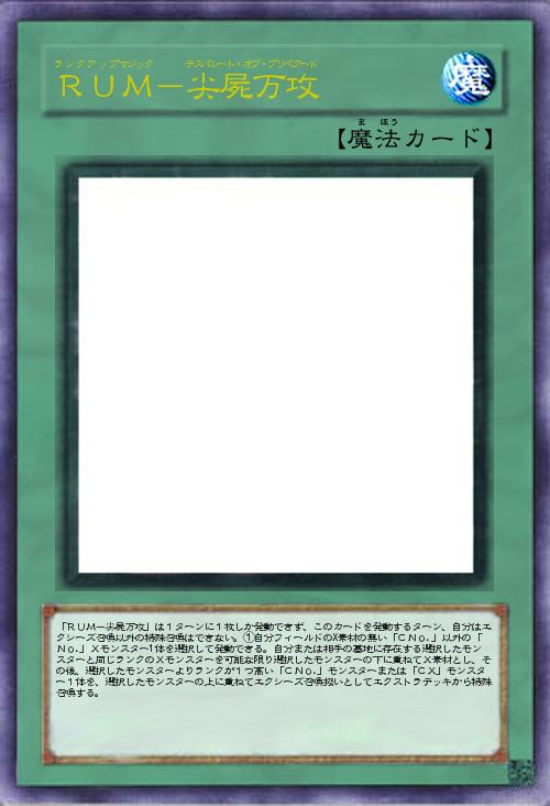 | 「RUM-尖屍万攻」は1ターンに1枚しか発動できず、このカードを発動するターン、自分はエクシーズ召喚以外の特殊召喚はできない。①自分フィールドのX素材の無い「CNo.」以外の「No.」Xモンスター1体を選択して発動できる。自分または相手の墓地に存在する選択したモンスターと同じランクのXモンスターを可能な限り選択したモンスターの下に重ねてX素材とし、その後、選択したモンスターよりランクが1つ高い「CNo.」モンスターまたは「CX」モンスター1体を、選択したモンスターの上に重ねてエクシーズ召喚扱いとしてエクストラデッキから特殊召喚する。 | |||
