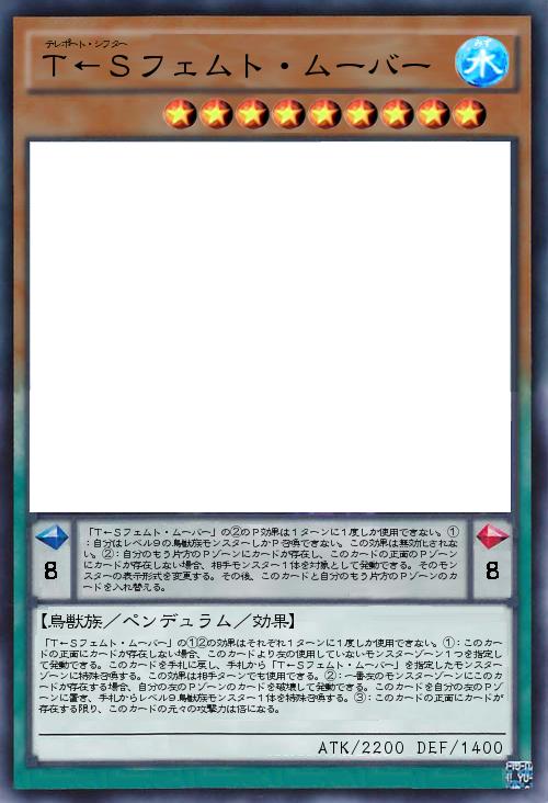 | 「T←Sフェムト・ムーバー」の①②の効果はそれぞれ1ターンに1度しか使用できない。①:このカードの正面にカードが存在しない場合、このカードより左の使用していないモンスターゾーン1つを指定して発動できる。このカードを手札に戻し、手札から「T←Sフェムト・ムーバー」を指定したモンスターゾーンに特殊召喚する。この効果は相手ターンでも使用できる。②:一番左のモンスターゾーンにこのカードが存在する場合、自分の左のPゾーンのカードを破壊して発動できる。このカードを自分の左のPゾーンに置き、手札からレベル9鳥獣族モンスター1体を特殊召喚する。③:このカードの正面にカードが存在する限り、このカードの元々の攻撃力は倍になる。 | |||