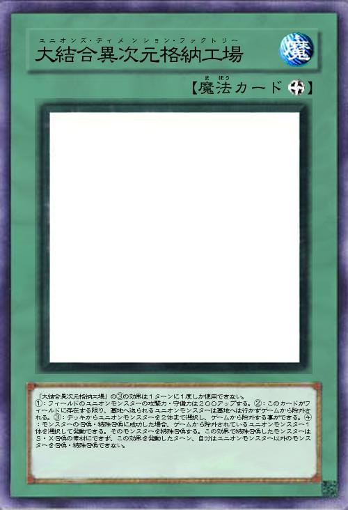 | 「大結合異次元格納工場」の③の効果は1ターンに1度しか使用できない。 ①:フィールドのユニオンモンスターの攻撃力・守備力は200アップする。②:このカードがフィールドに存在する限り、墓地へ送られるユニオンモンスターは墓地へは行かずゲームから除外される。③:デッキからユニオンモンスターを2体まで選択し、ゲームから除外する事ができる。④:モンスターの召喚・特殊召喚に成功した場合、ゲームから除外されているユニオンモンスター1体を選択して発動できる。そのモンスターを特殊召喚する。この効果で特殊召喚したモンスターはS・X召喚の素材にできず、この効果を発動したターン、自分はユニオンモンスター以外のモンスターを召喚・特殊召喚できない。 | |||