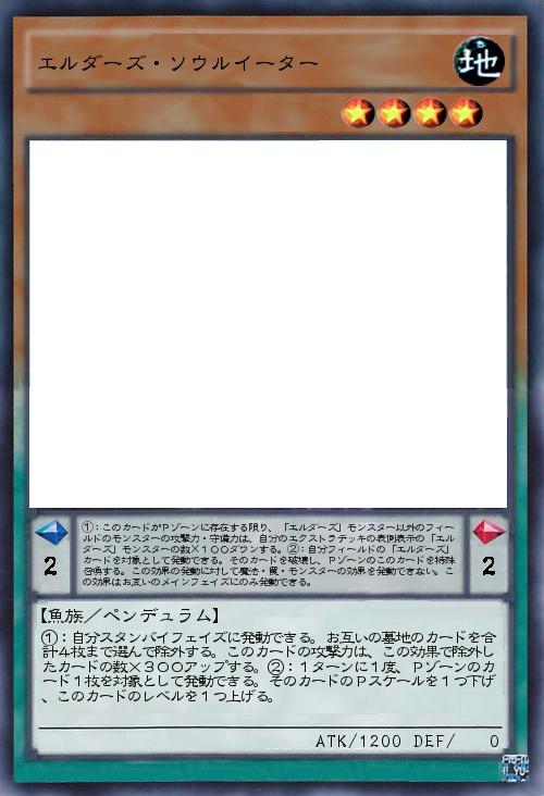 | ①:このカードがPゾーンに存在する限り、「エルダーズ」モンスター以外のフィールドのモンスターの攻撃力・守備力は、自分のエクストラデッキの表側表示の「エルダーズ」モンスターの数×100ダウンする。②:自分フィールドの「エルダーズ」カードを対象として発動できる。そのカードを破壊し、Pゾーンのこのカードを特殊召喚する。この効果の発動に対して魔法・罠・モンスターの効果を発動できない。この効果はお互いのメインフェイズにのみ発動できる。 | |||