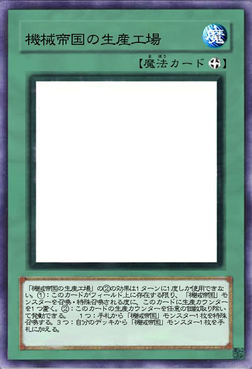 | 「機械帝国の生産工場」の②の効果は1ターンに1度しか使用できない。①:このカードがフィールド上に存在する限り、「機械帝国」モンスターを召喚・特殊召喚される度に、このカードに生産カウンターを1つ置く。②:このカードの生産カウンターを任意の個数取り除いて発動できる。⚫︎1つ:手札から「機械帝国」モンスター1枚を特殊召喚する。3つ:自分のデッキから「機械帝国」モンスター1枚を手札に加える。 | |||