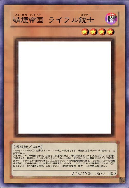 | このモンスターの①の効果は1ターンに一度しか使用できず、連続した自分ターンに使用することができない。 ①自分のターン時発動できる。手札を1枚墓地に送り、場に存在するカードまたは手札1枚を選んで破壊する。破壊したカードがモンスターであった場合、更に手札を1枚墓地に送ることで破壊したカードをゲームから除外できる。②このモンスターの攻撃時発動できる。このモンスターの攻撃を無効にして相手の手札を1枚見ずに破壊する。その後、このモンスターを守備表示にする。③このモンスターが守備表示の時、このモンスターは相手の魔法、罠カードの対象にならない。 | |||