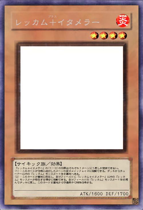 | 「レッカム+イタメラー」の(1)(2)の効果はそれぞれ1ターンに1度しか使用できない。 (1):このカードが召喚に成功したターンの自分メインフェイズに発動できる。デッキからチューナー以外の「レッカム」モンスター1体を墓地へ送る。 (2):このカードが墓地に存在し、自分フィールドに「レッカム+イタメラー」以外の「レッカム」モンスターが存在する場合に発動できる。自分フィールドの「レッカム」モンスター1体を選んでデッキに戻し、このカードを墓地から守備表示で特殊召喚する。 | |||