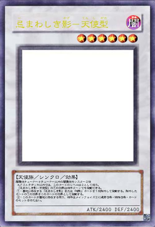 | 闇属性チューナー+チューナー以外の闇属性モンスター2体 エクストラデッキ以外では、このカードのレベルは2として扱う。 「忌まわしき影-天使型」の①の効果は相手ターンでも発動できる。 ①:墓地に存在する「忌まわしき影」または「暗影」カードを1枚除外して発動する。除外したカードの①の効果をこのカードの効果として発動する。 ②:このカードが墓地に存在する限り、相手はメインフェイズ2に通常召喚・特殊召喚・カードのセットを行えない。 | |||