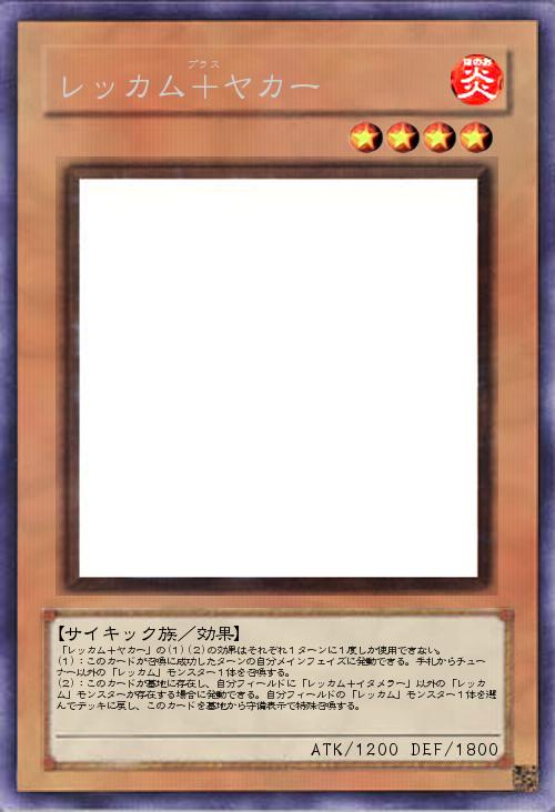 | 「レッカム+ヤカー」の(1)(2)の効果はそれぞれ1ターンに1度しか使用できない。 (1):このカードが召喚に成功したターンの自分メインフェイズに発動できる。手札からチューナー以外の「レッカム」モンスター1体を召喚する。 (2):このカードが墓地に存在し、自分フィールドに「レッカム+イタメラー」以外の「レッカム」モンスターが存在する場合に発動できる。自分フィールドの「レッカム」モンスター1体を選んでデッキに戻し、このカードを墓地から守備表示で特殊召喚する。 | |||