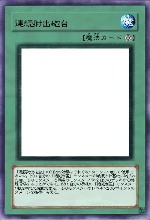 | 「連続射出砲台」の①②の効果はそれぞれ1ターンに1度しか使用できない。①:自分の「機械帝国」モンスターが破壊され墓地に送られた時、そのモンスターと同名のモンスター1体を自分のデッキから特殊召喚することができる。②:自分の手札の「機械帝国」モンスター1枚を捨てて発動できる。そのモンスターのレベル×200ポイントのダメージを相手に与える。 | |||