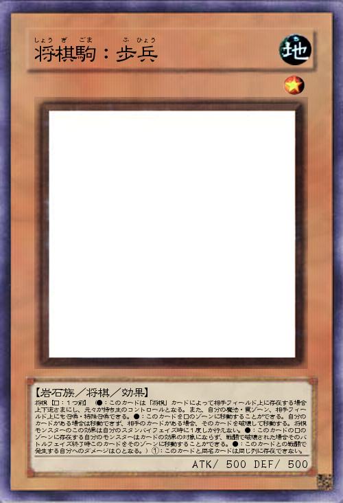 | 将棋【□:1つ前】(●:このカードは「将棋」カードによって相手フィールド上に存在する場合上下逆さまにし、元々が持ち主のコントロールとなる。また、自分の魔法・罠ゾーン、相手フィールド上にも召喚・特殊召喚できる。●:このカードを□のゾーンに移動することができる。自分のカードがある場合は移動できず、相手のカードがある場合、そのカードを破壊して移動する。将棋モンスターのこの効果は自分のスタンバイフェイズ時に1度しか行えない。●:このカードの□のゾーンに存在する自分のモンスターはカードの効果の対象にならず、戦闘で破壊された場合そのバトルフェイズ終了時このカードをそのゾーンに移動することができる。●:このカードとの戦闘で発生する自分へのダメージは0となる。)①:このカードと同名カードは同じ列に存在できない。 | |||
