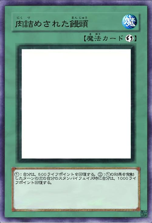 「肉まんを作りたかった。肉まんだけだと味気ないので饅頭にしました(カード名)。肉まんって肉が入った饅頭ということで、肉まんなのでしょうか?このカード1枚でラグは、ありますが1500のライフを回復できます。」(2015-08-28 15:50)